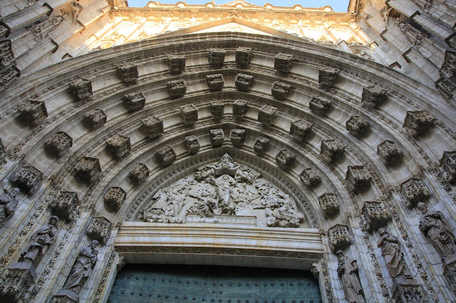 Su confección se encuadra en el siglo XV bajo la autoría de Lorenzo Mercadante de Bretaña y Pedro Millán. Concretamente el conjunto escultórico se le reconoce al español, mientras que la escena desarrollada en el espacio semicircular del frontón de este acceso es conferida al maestro anglosajón. En